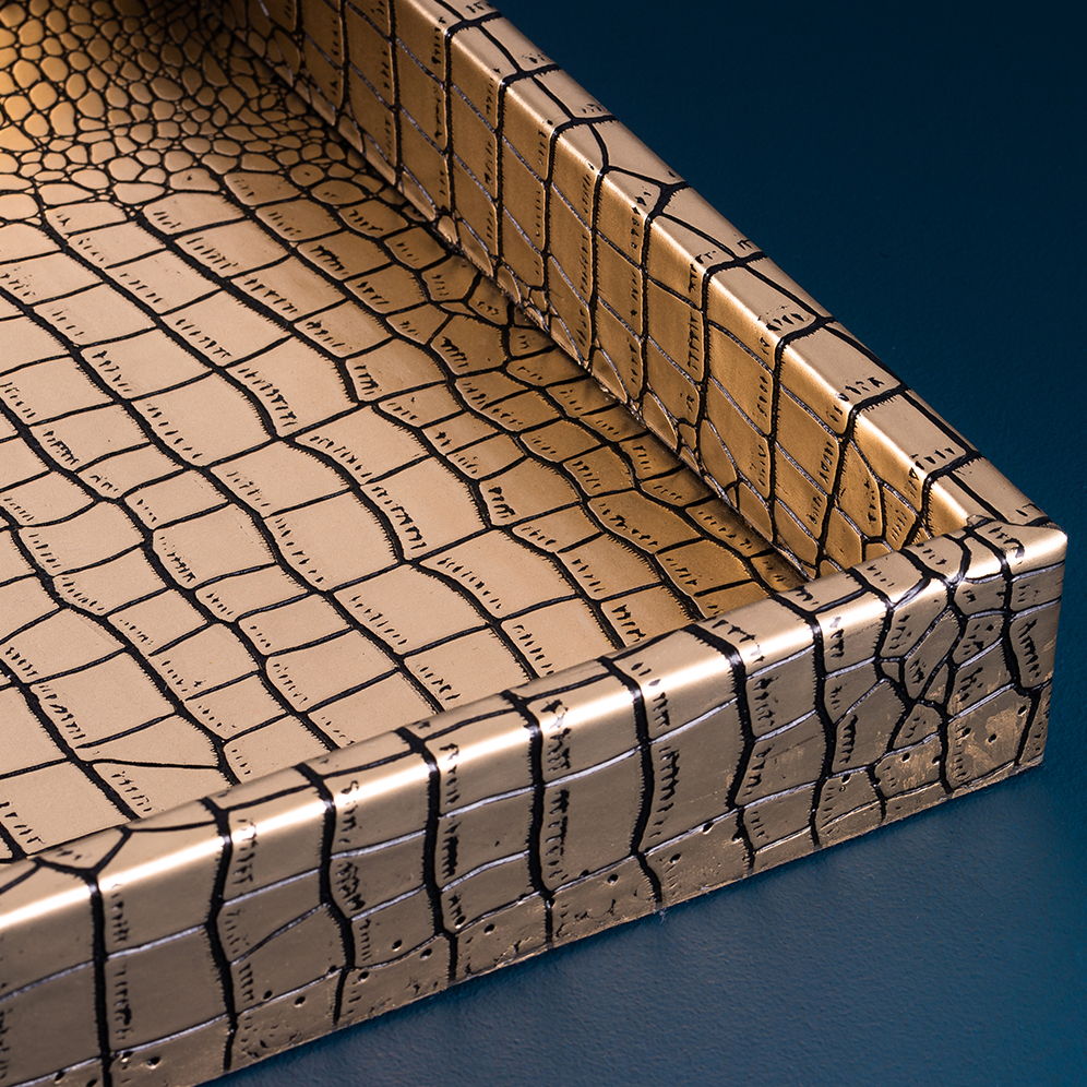 A luxurious tray with crocodile effect patterning in soft matt gold and black.