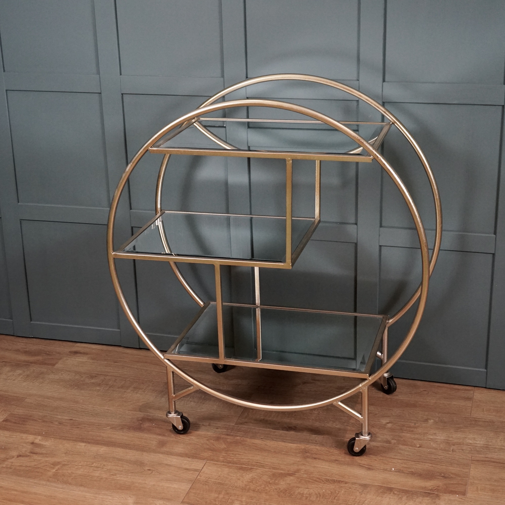The Champagne Art Deco Drinks Trolley metal frame is finished in an antique champagne silver colour. It boasts three polished glass mirror shelves on which to display and transport your drinks apparel and show-stopping accessories in beautiful retro style.