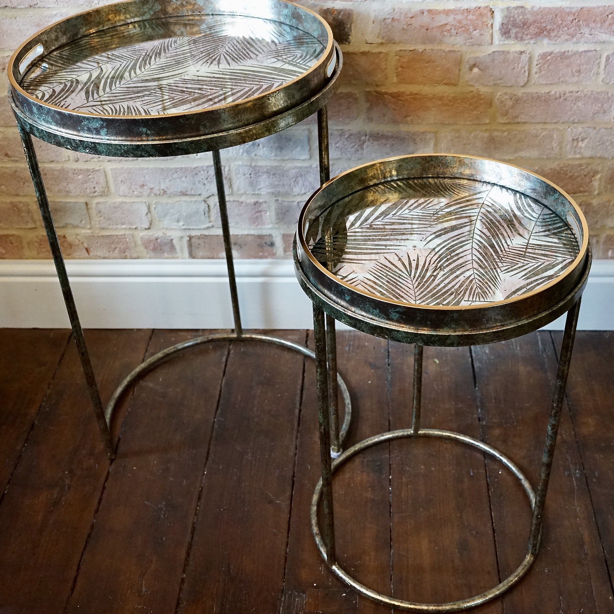 Two gorgeous nest tables with fabulous fern patterned mirror tray tops.