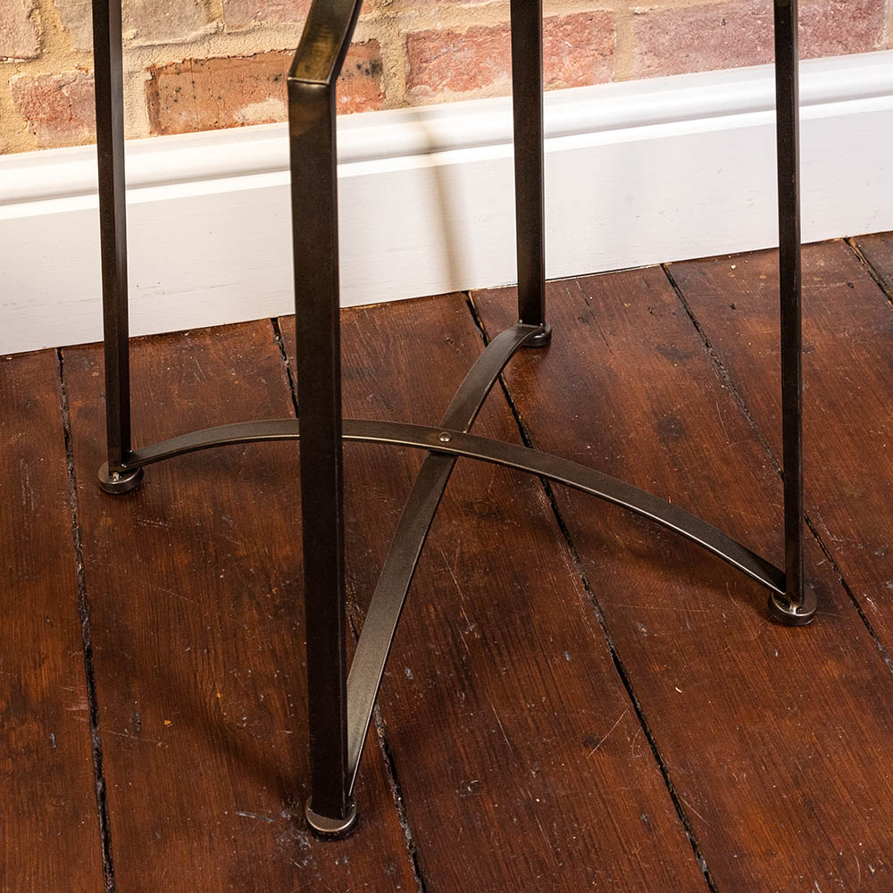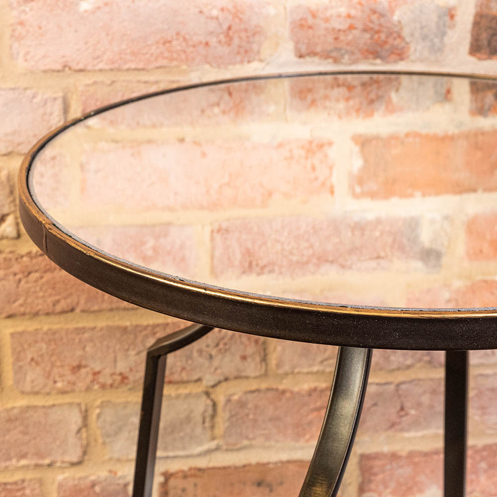 Of a modern, contemporary design these beautiful tables are finished in a deep brown metal with a distressed finish and polished mirror tops.
