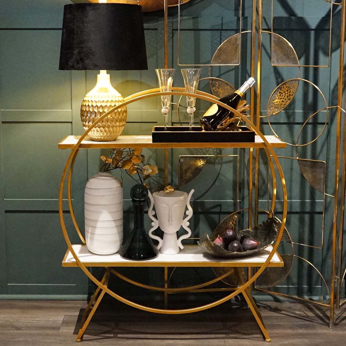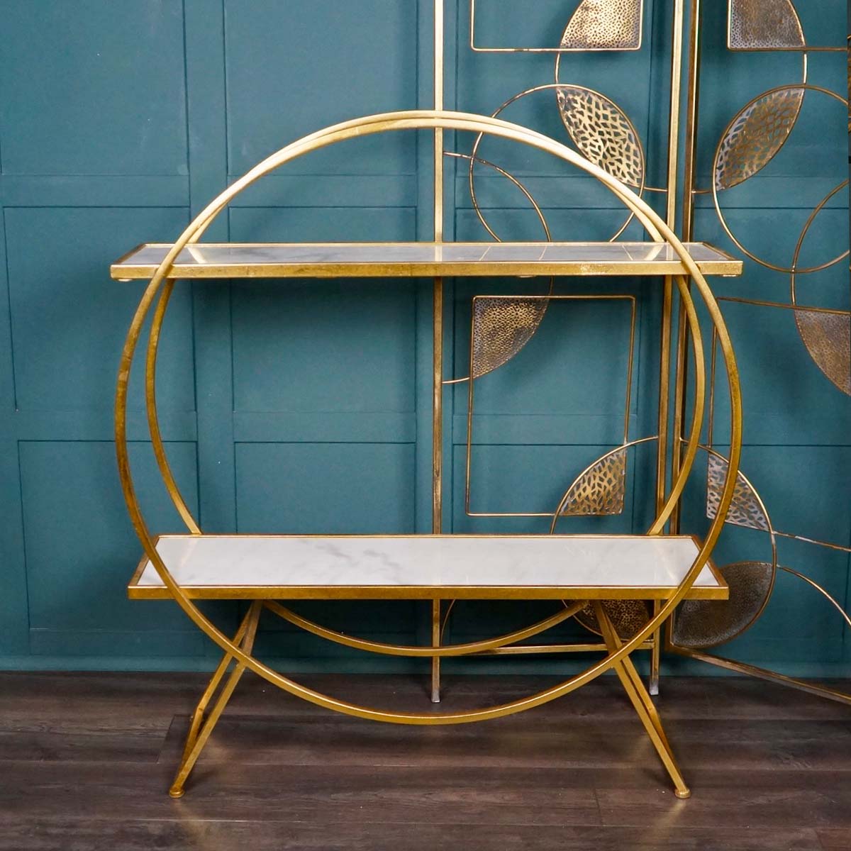 Present your showpiece items elegantly with this spectacular round display shelving unit. The frame is finished in a stunning antique gold colour with a soft distressed finish, which adds sassy drama to any room. The two polished white marble shelves make the perfect setting for all things fabulous. This exquisite marble, lining both of the generous shelves, has smokey grey tones throughout.