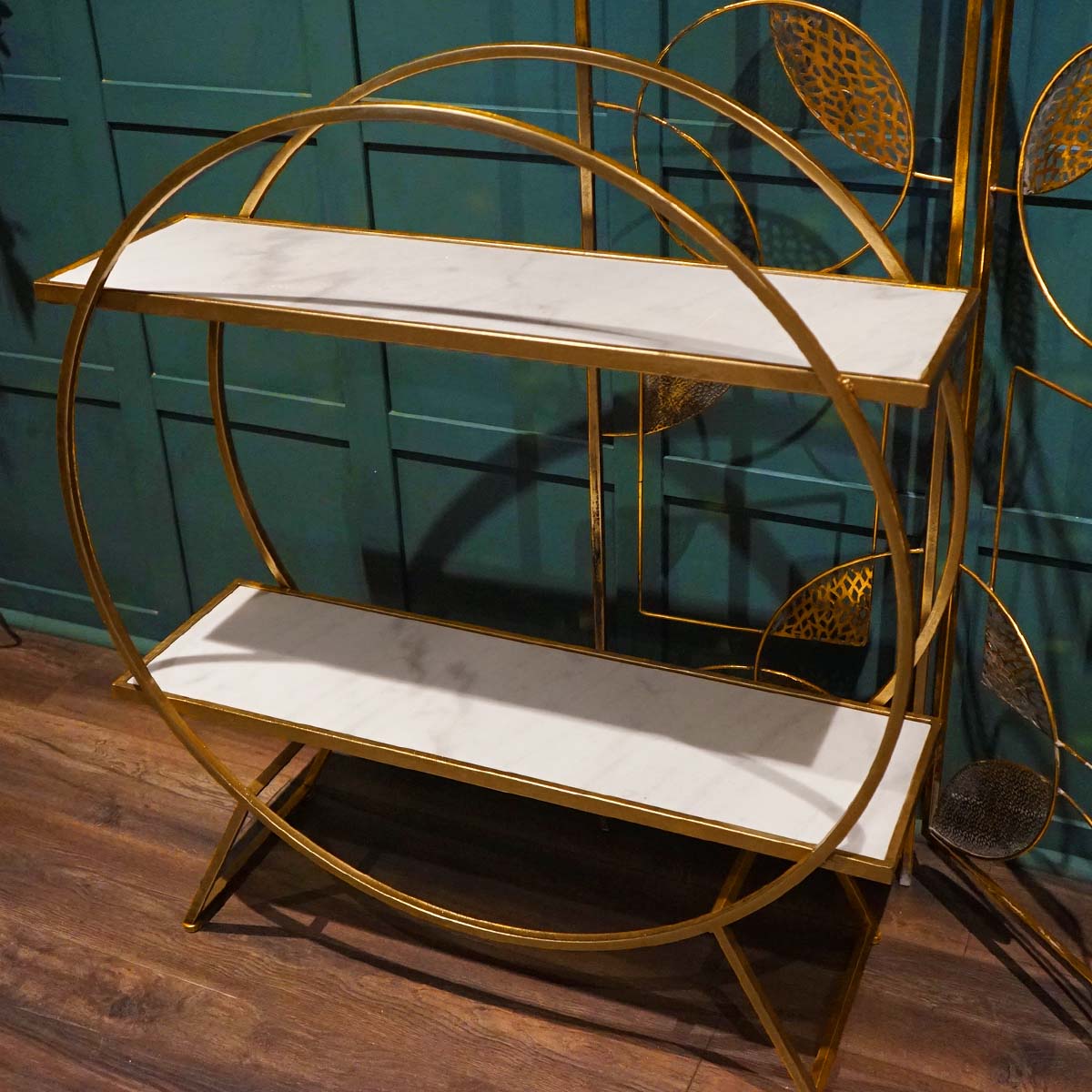 Display your treasures in ultimate grandeur with this Gold and Marble Shelving Console