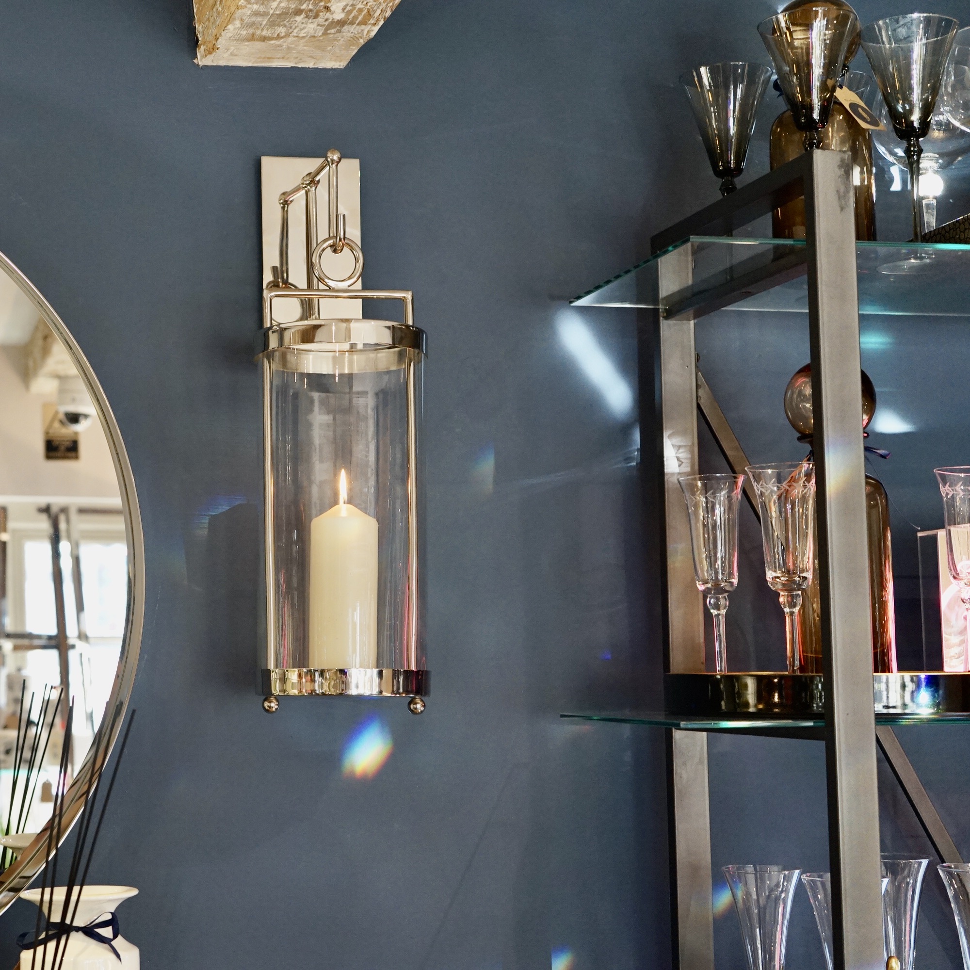 This striking glass and silver lantern can be easily detached from the wall holder.