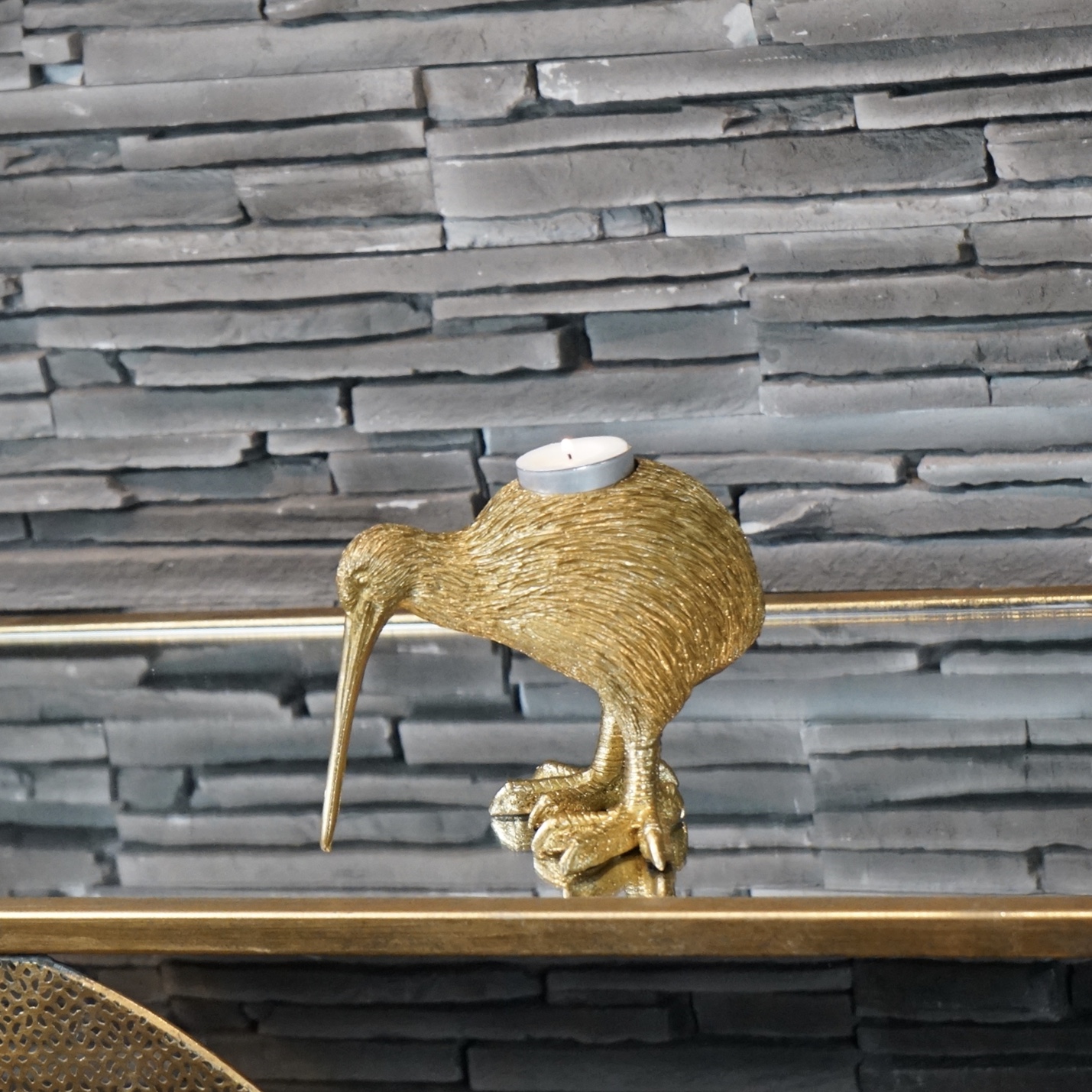How adorable is this charming little t light holder in the shape of a gold Kiwi bird.