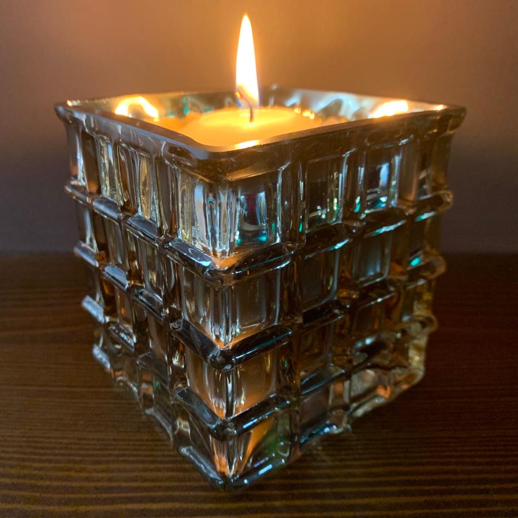 The soft glow from the candle shines through the glass to create a fabulous glittering effect.