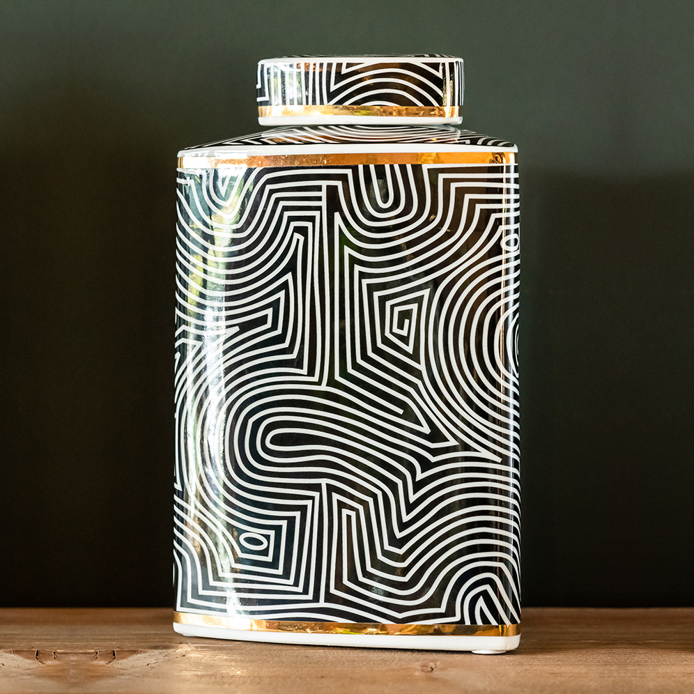 On a white background a dramatic black, jewel like burnt orange and glamorous gold pattern wraps it’s self around this striking jar.