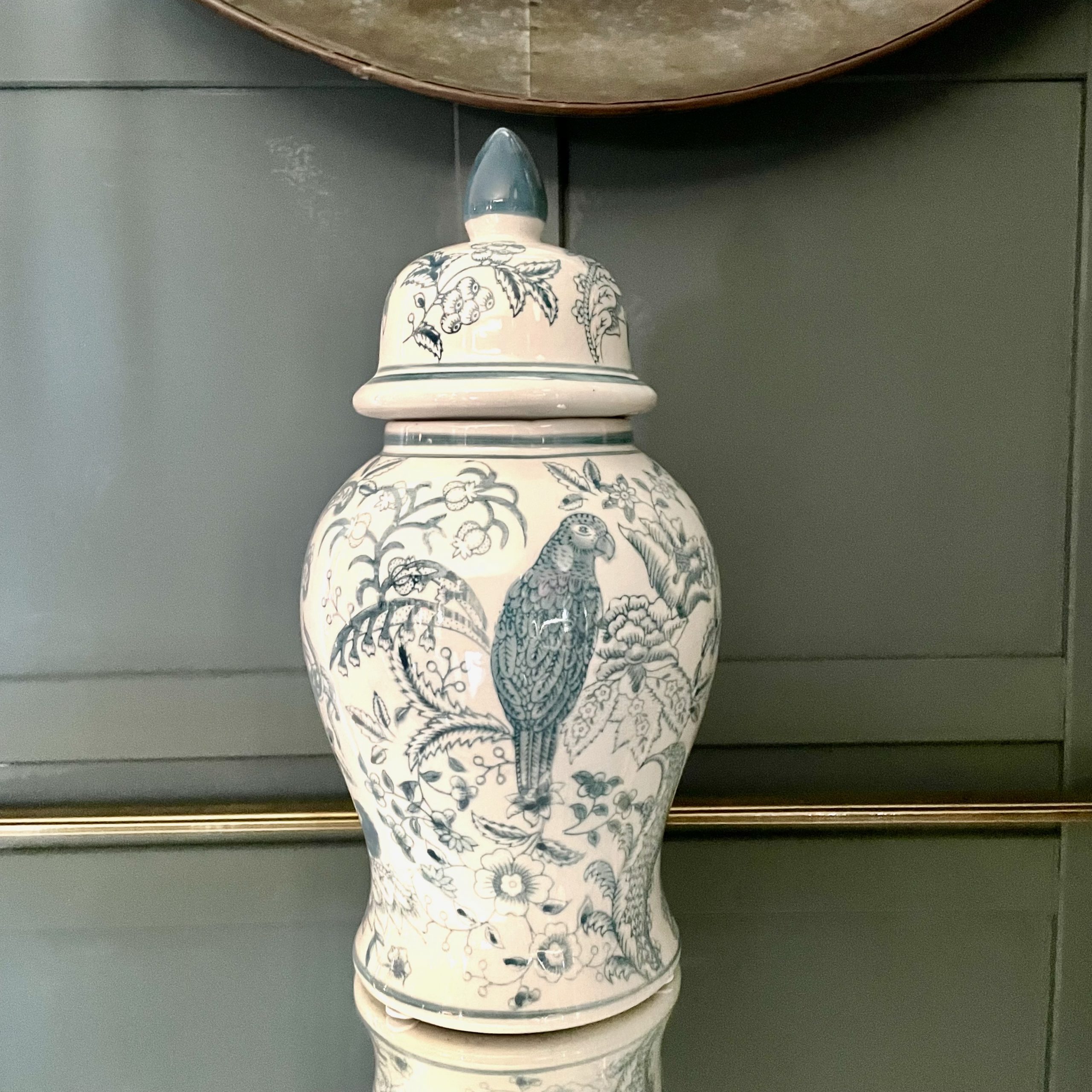 In smooth hand finished ceramic, this pretty white lidded jar features a graceful abstract floral design in soft teal. A parrot perching on a branch creates the focal point to the floral design.