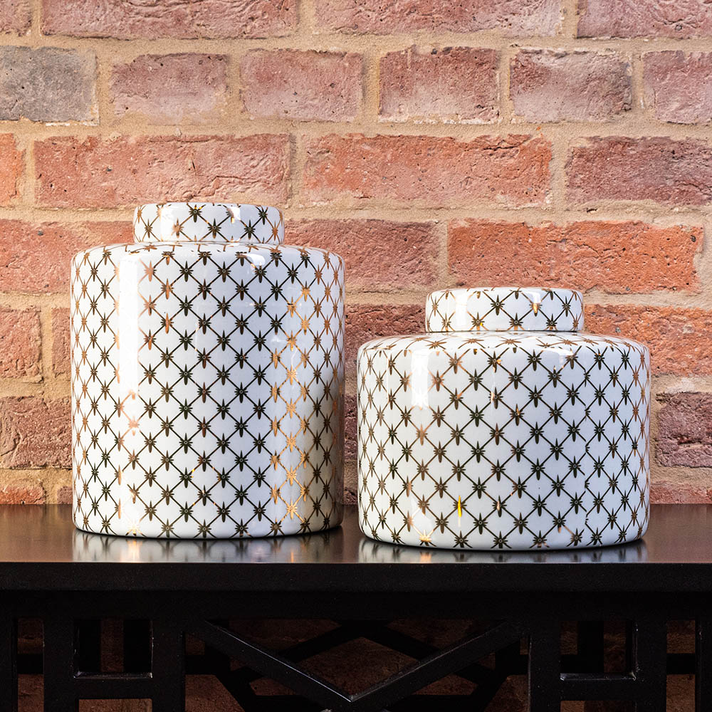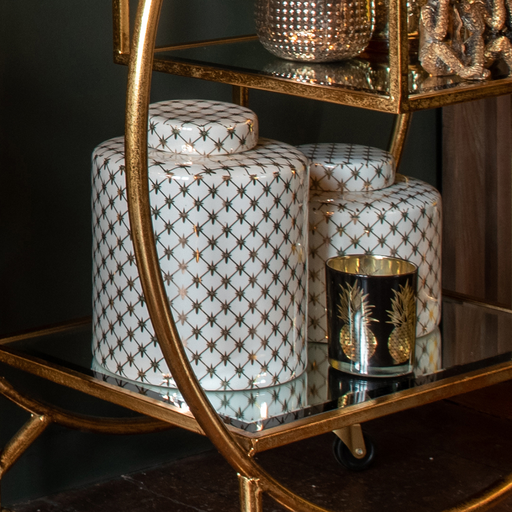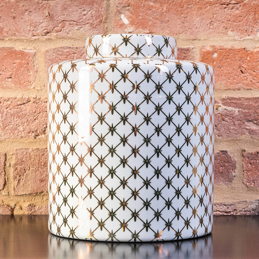 Elegant porcelain gold and white patterned t jar. Beautiful and stylish this t jar would look perfect in any setting.