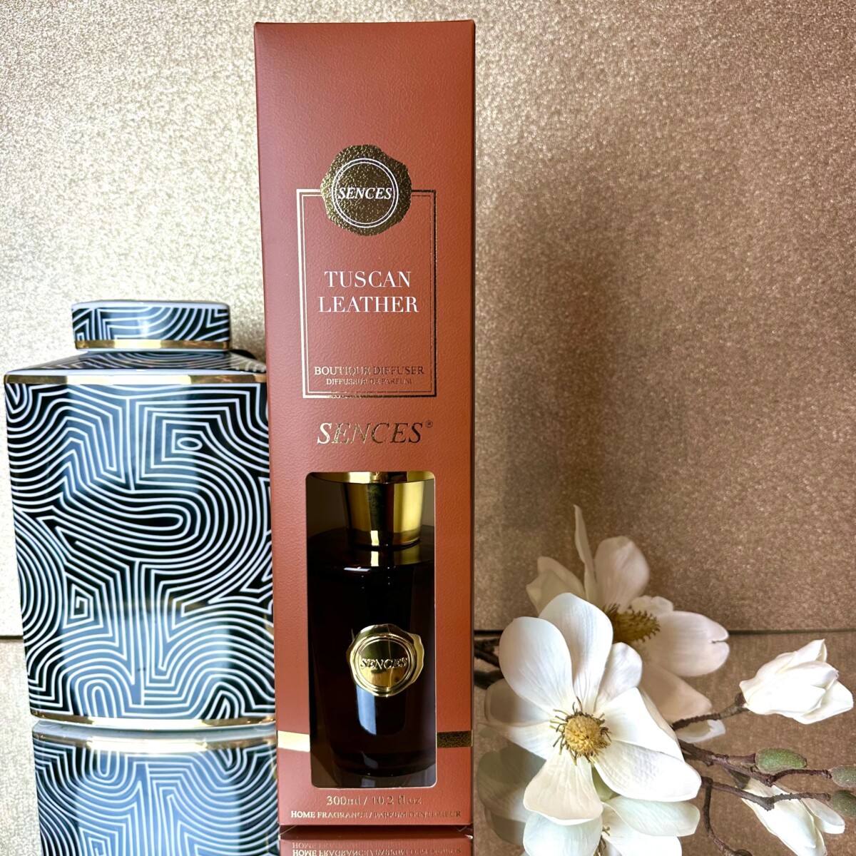 The beautiful and warm fragrance of Tuscan Leather is presented in a luxurious and stylish bottle, black reeds compliment the look.