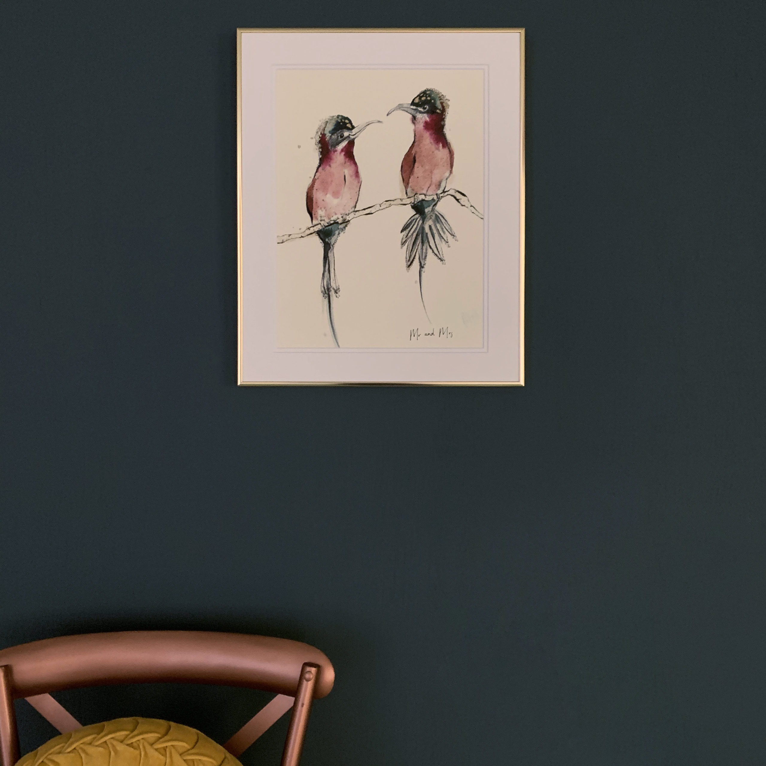 Striking a pose on their shared branch Mr and Mrs are colourful tropical birds in muted pinks, reds and greens with flashes of soft gold which stand out beautifully from the soft neutral background.